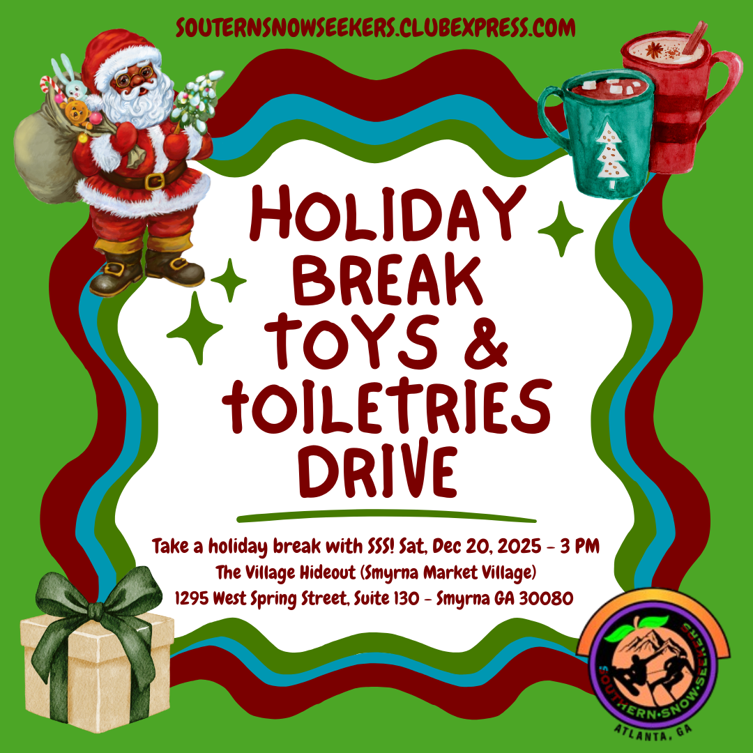 The Southern Snow Seekers Ski Club: Toys and Toiletries Holiday Drive! We would love for club members and friends to join us in spreading warmth and joy this holiday season. We do more than just ski, we support our community. Bring donations, relax and enjoy a holiday break with us at The Village Hideout in Smyrna Market Village. Order drinks and food; take a break from your holiday shopping and connect with fellow Snow Seekers and friends.